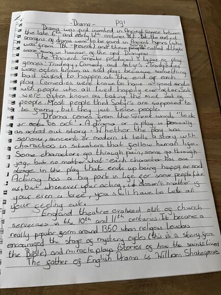 Diemante, a year 7 pupil, said, "Studying Drama has inspired me to read other Greek tragedies and poems. I have now researched and studied Greek Theatre and its evolution in England in the 10th and 11th century before 1350, where it became popular to enact religious stories of how saints lived from The Bible. William Shakespeare, the father of English Drama, wrote 18 comedies and 10 tragedies that we still love watching and listening to today."